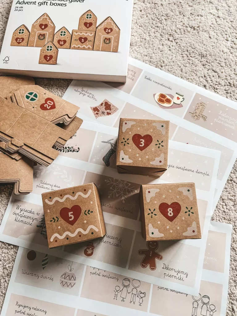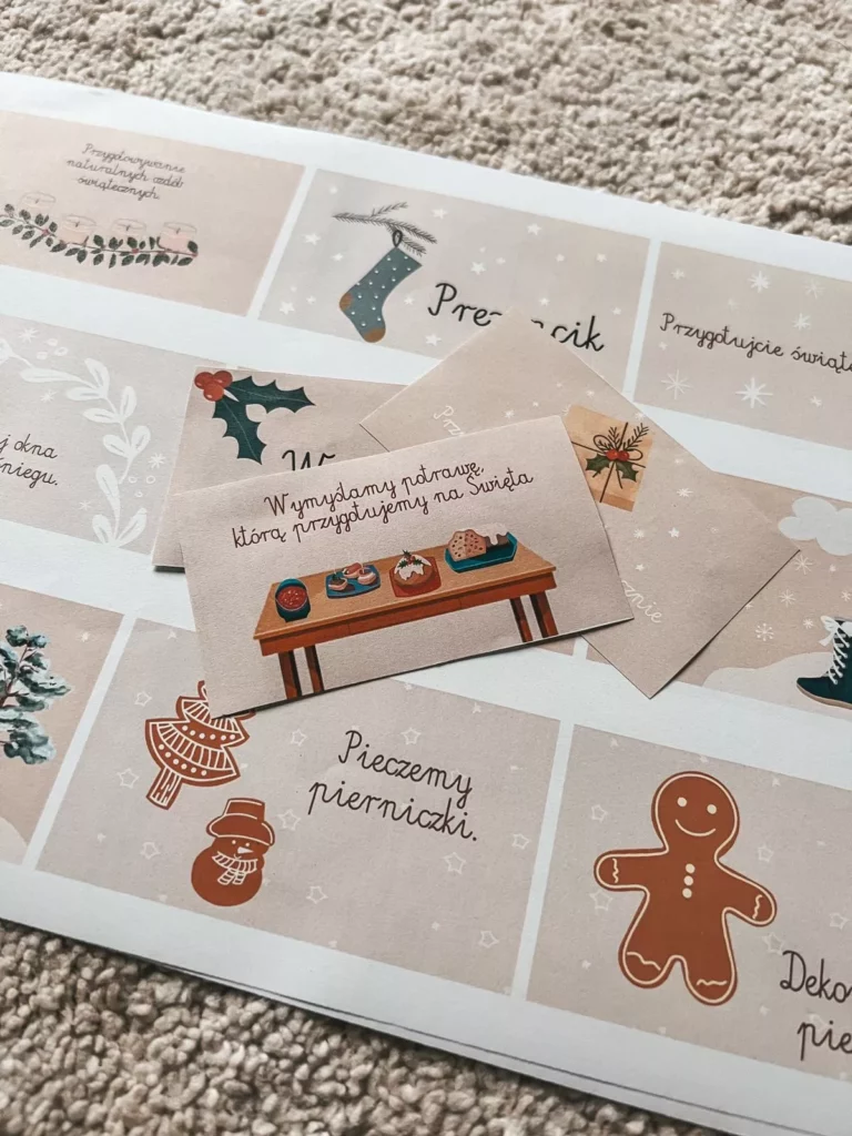 Poniżej znajdziecie propozycje aktywności do pobrania. Wybierzcie z nich 24 liściki, które umieścicie w kalendarzu adwentowym oraz wybierzcie kilka dodatkowych, które będziecie mieć w pogotowiu. Da Wam to możliwość dopasowania do waszego rytmu dnia lub tygodnia, ale też do pogody lub nastroju malucha. Ja nie raz korzystałam z tej opcji, gdy np. okazało się, że spadł śnieg i tego popołudnia możemy ulepić bałwana.
