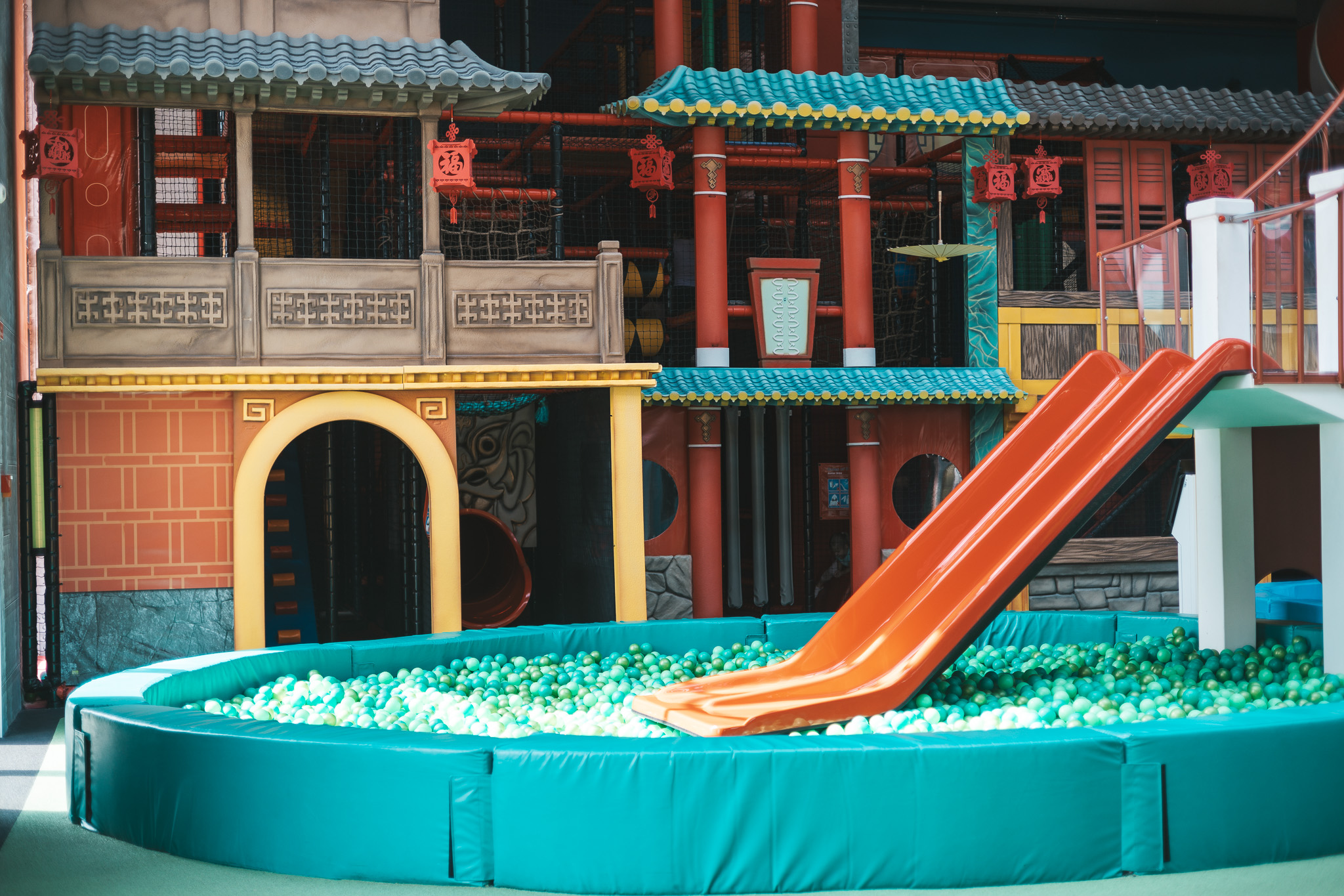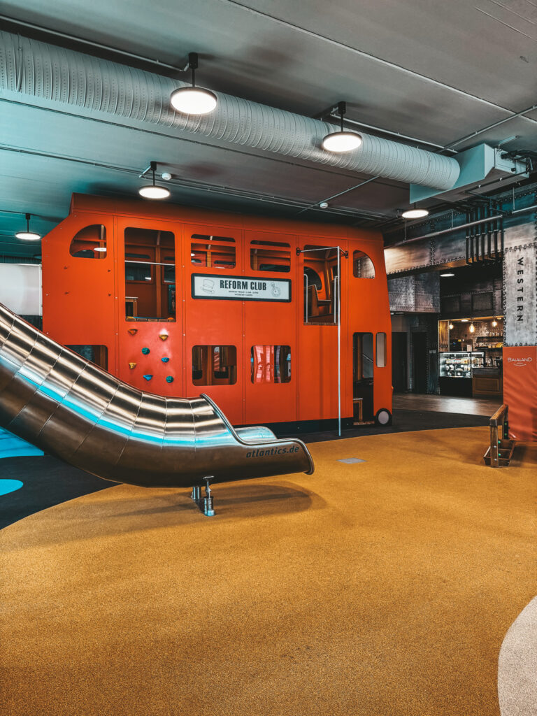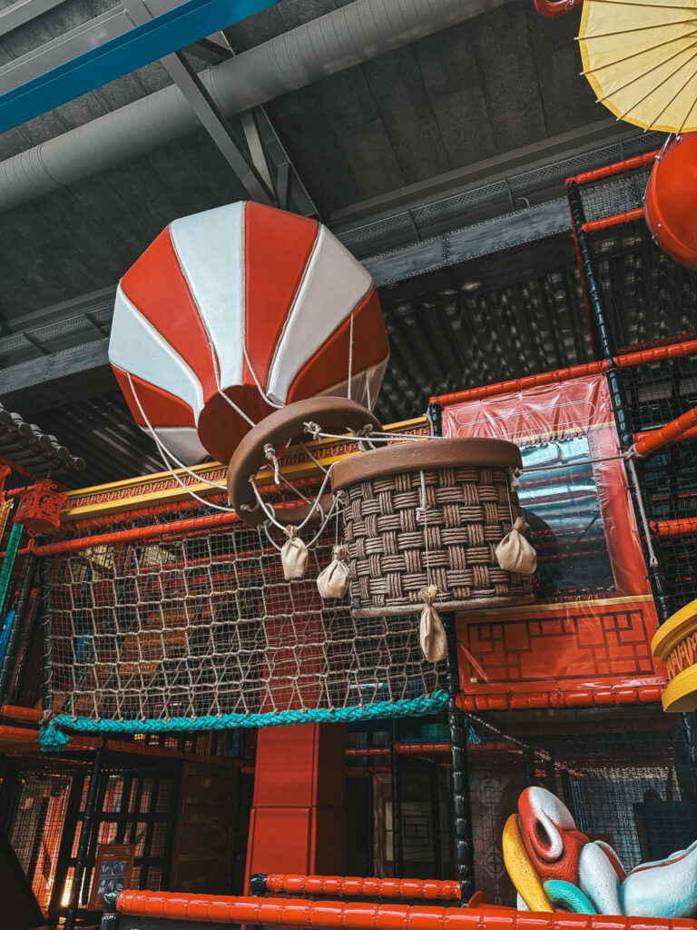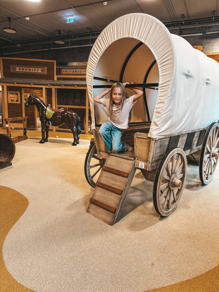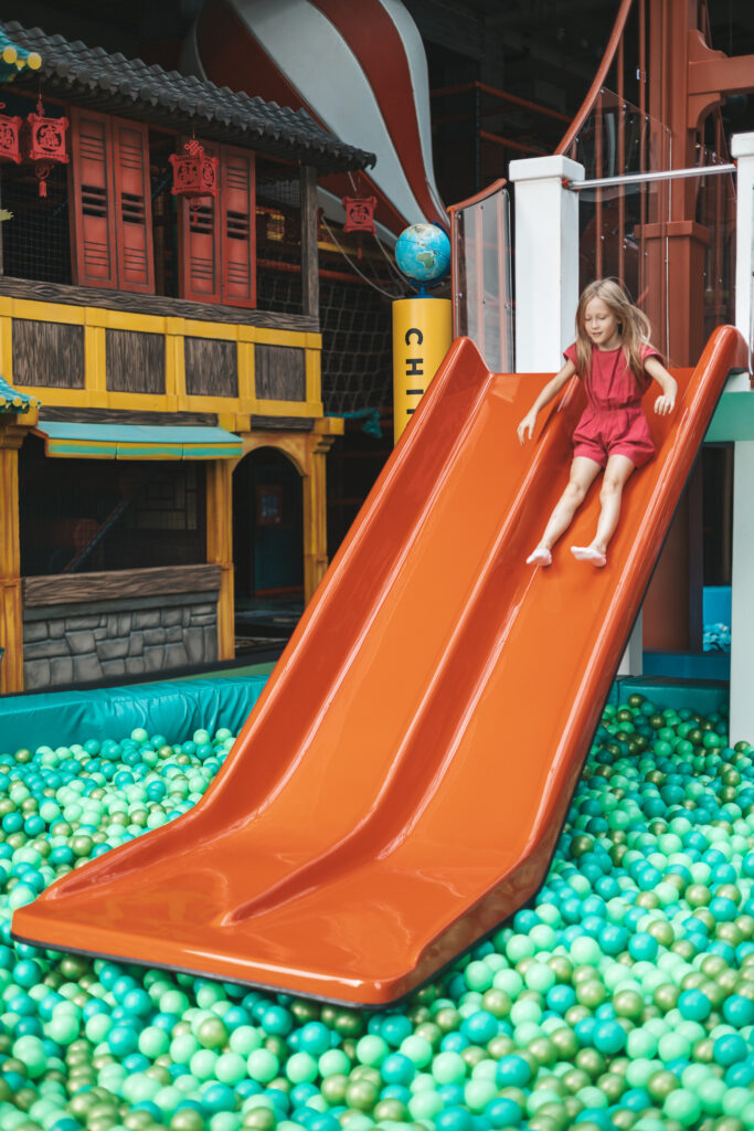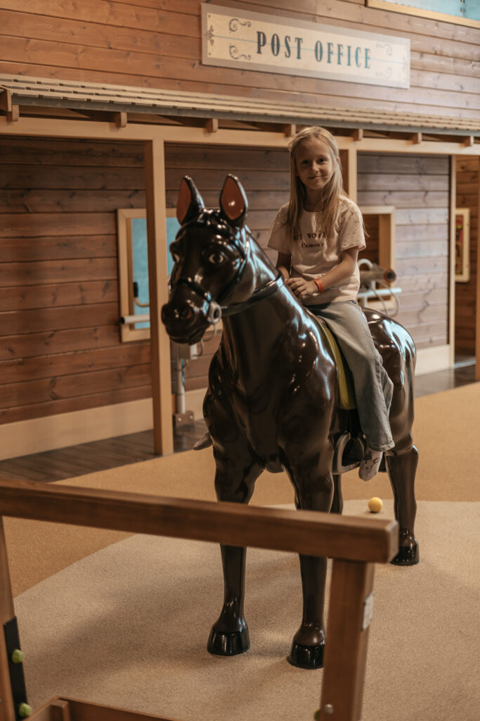 W części suchej, czyli sali zabaw, dzieci mogą korzystać z różnych tematycznych stref inspirowanych różnymi zakątkami świata – od Dzikiego Zachodu, przez orientalne klimaty, aż po Londyn.