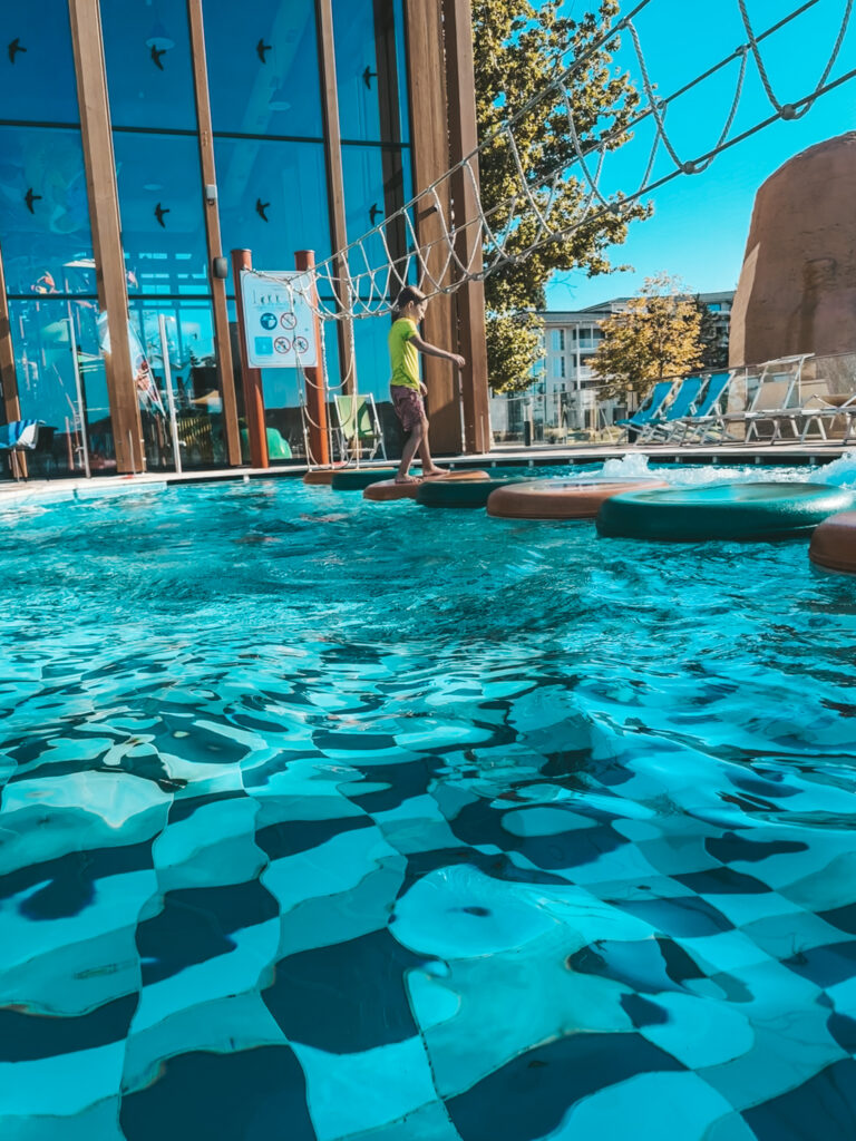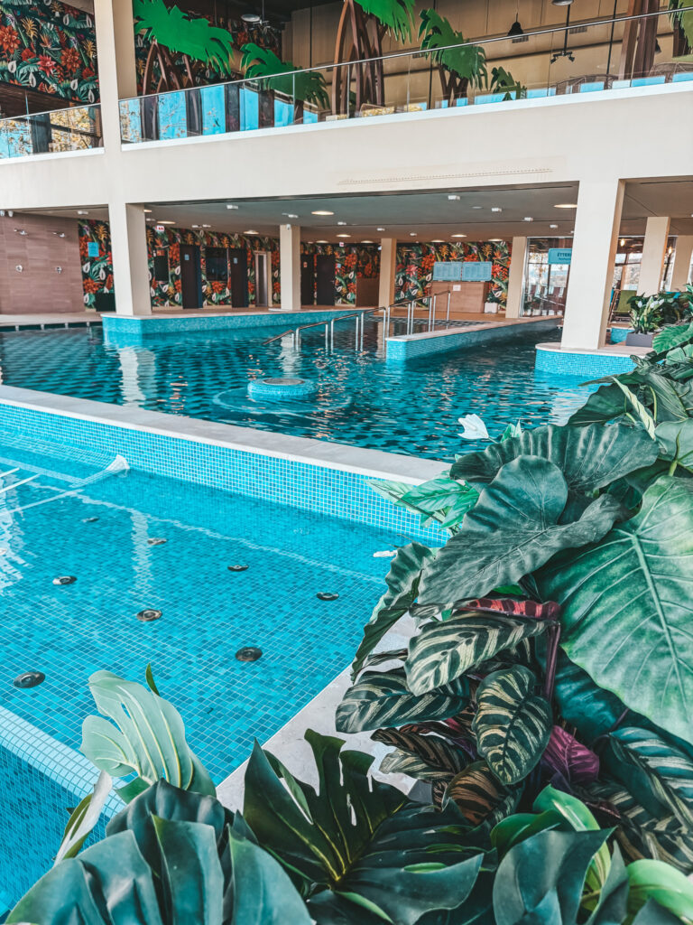 Woda w basenach jest ciepła – dla mnie to ogromny plus, bo nie znoszę zimnych kąpieli. Mogłam pływać razem z dziećmi bez poczucia dyskomfortu. Fajną atrakcją jest basenowy tor przeszkód. Zajął on dzieci na dobrą godzinę 🙂 Dla najmłodszych przygotowano oddzielny, bezpieczny basen ze zjeżdżalniami. To świetne rozwiązanie – maluszki mogą bawić się w swojej przestrzeni, a starsze dzieci szaleją obok w zupełnie innej strefie. Dzięki temu każdy wiek znajduje tu coś dla siebie, a goście hotelowi mają większy komfort i spokój.