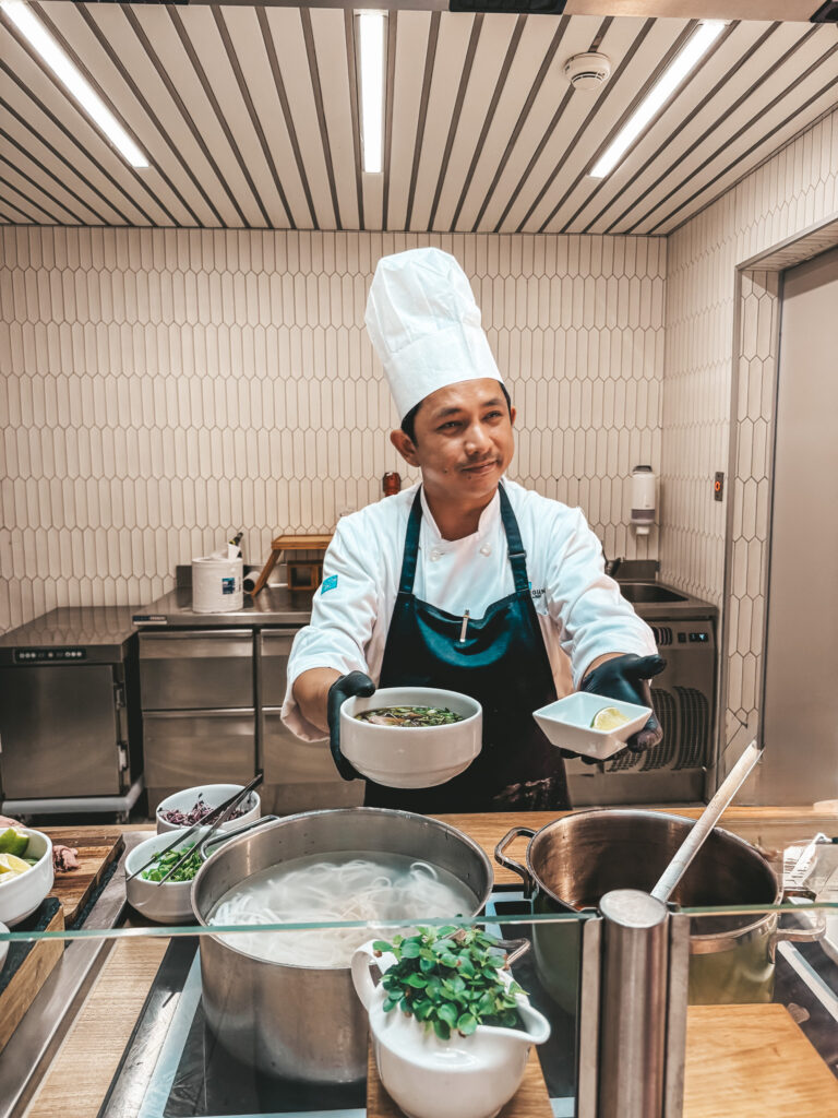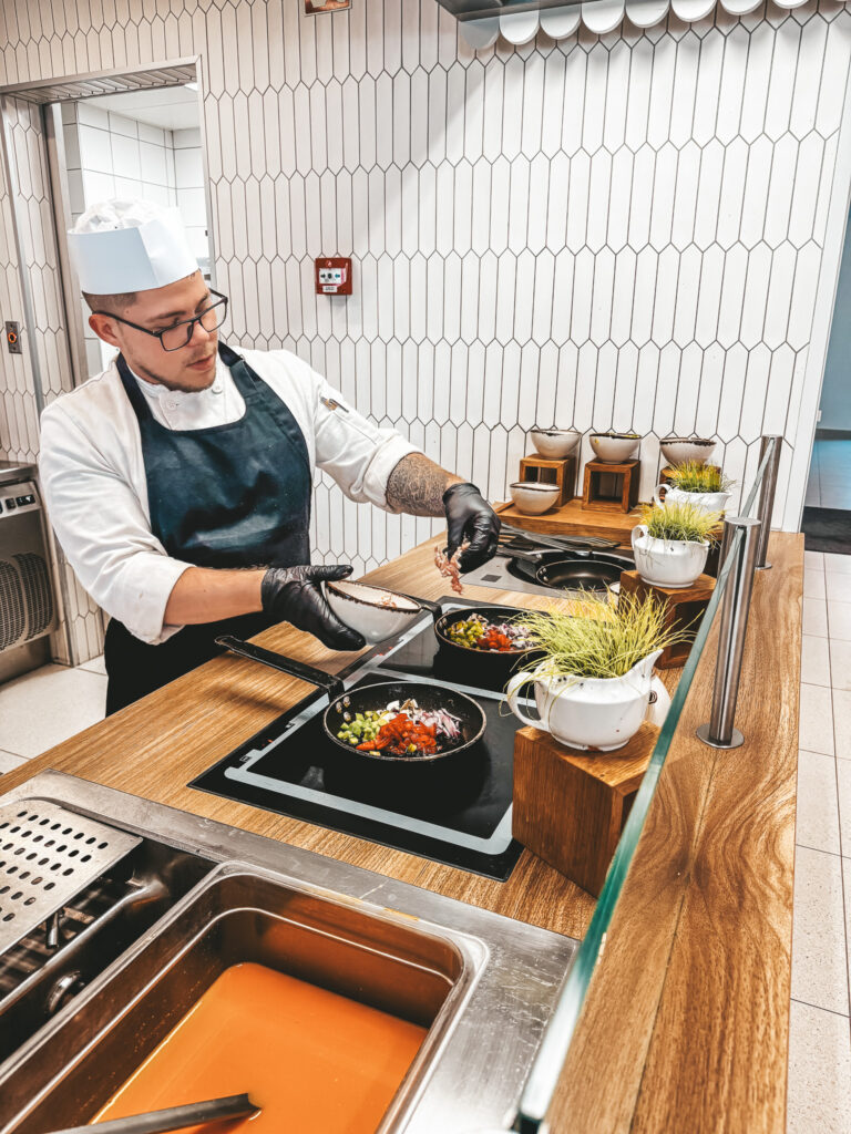 Ogromne wrażenie zrobiły na nas kolacje tematyczne – trafiliśmy na wieczór włoski, azjatycki, amerykański i arabski. Codziennie mogliśmy próbować innych smaków – makaron przygotowywany na żywo, sushi, zupy pho, burgery… mieliśmy poczucie, jakbyśmy każdego dnia byli w innej restauracji.