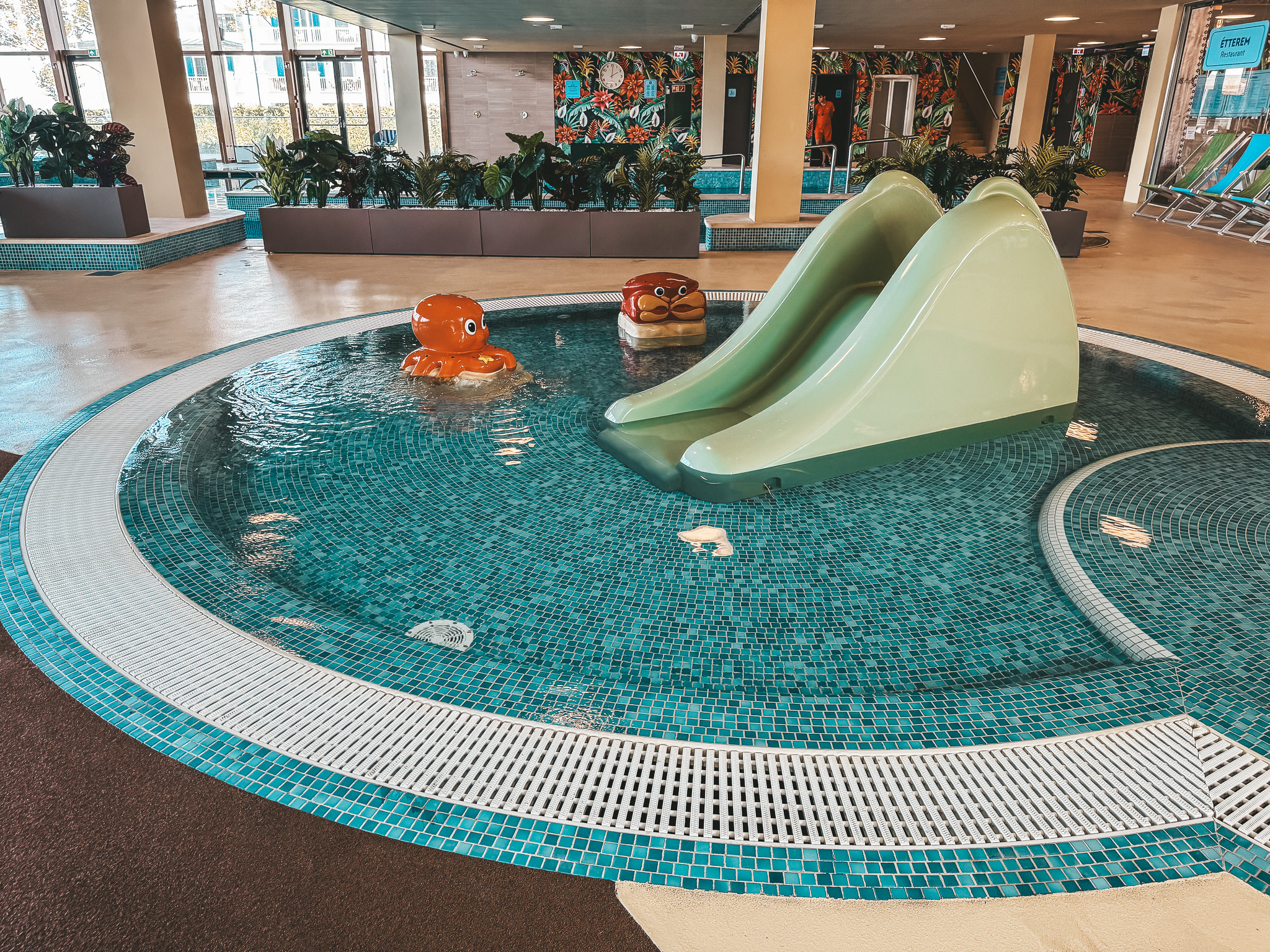 Na piętrze znajduje się strefa relaksu z widokiem na całą część wodną – idealne rozwiązanie, gdy chcemy, żeby maluch zdrzemnął się w wózku, a my nie musimy wracać do pokoju. Widziałam tam kilku rodziców odpoczywających przy kawie, podczas gdy ich maluszki spały obok – genialne rozwiązanie.