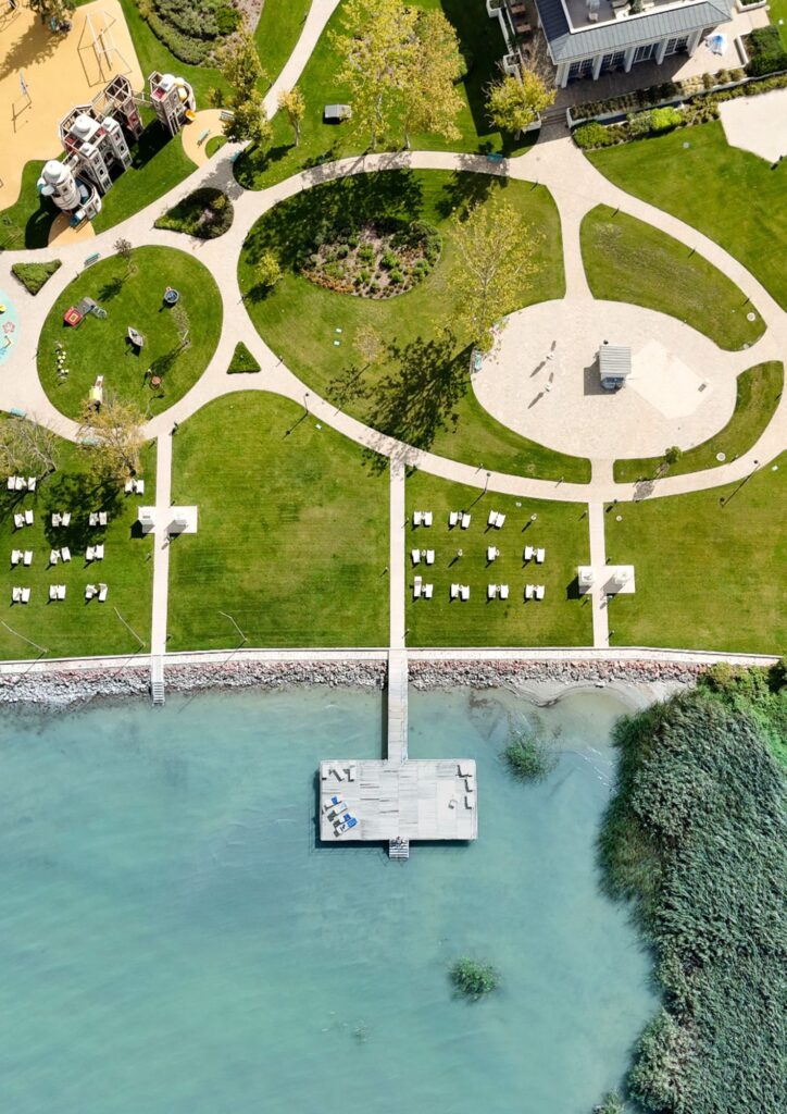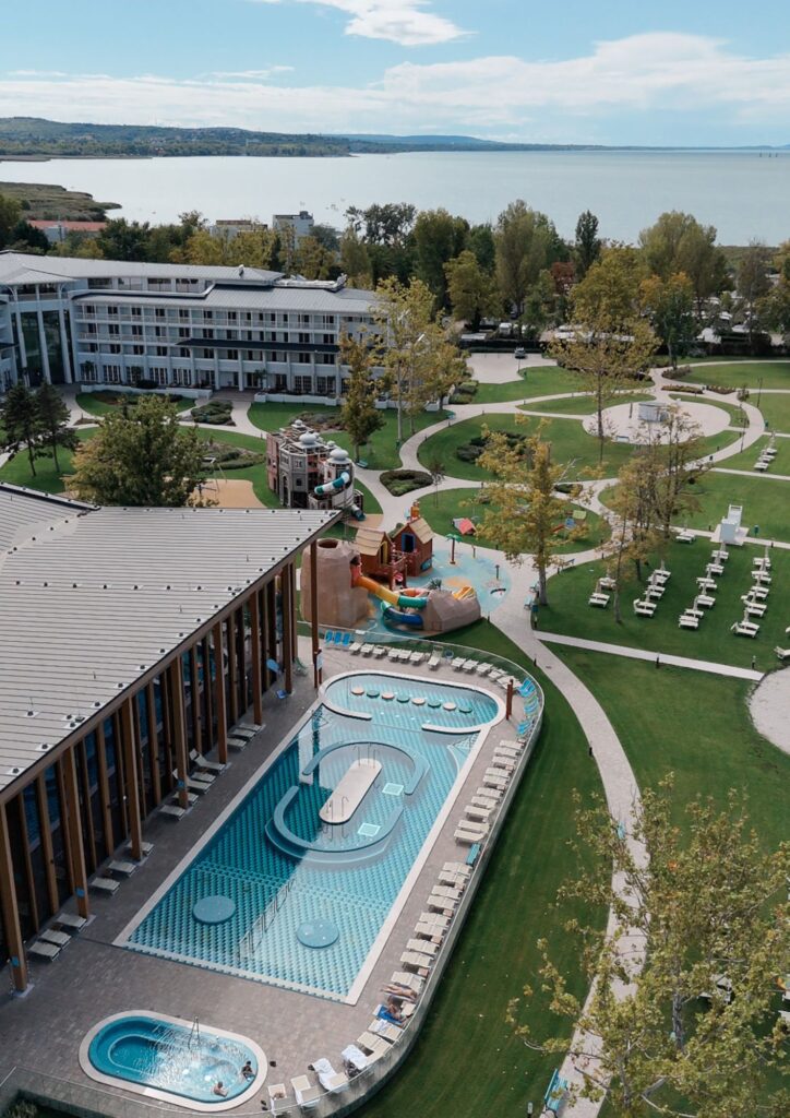 Hotel położony jest w miejscowości Szántód, tuż nad brzegiem Balatonu. Już sama okolica robi ogromne wrażenie – z jednej strony widok na taflę jeziora, z drugiej pięknie utrzymane ogrody i przestrzeń do spacerów. Zieleń, zadbane alejki i nowoczesna architektura hotelu tworzą atmosferę, w której można naprawdę odpocząć.
