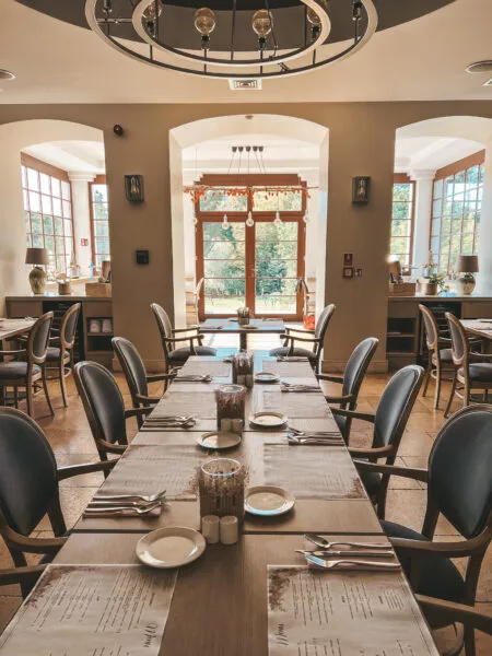 Wyjątkowe, pastelowe wnętrze restauracji oplatające gości ciepłem słonecznego światła, wpadającego przez wielkie okna, czyni ją miejscem magicznym o każdej porze roku. Położona centralnie w pałacu restauracja, harmonijnie łączy się z pięknym pałacowym parkiem za sprawą rozległego tarasu, który zaprasza do chwil relaksu na świeżym powietrzu. Szef kuchni stworzył menu, które łączy klasyczne dania kuchni europejskiej i polskiej z lokalnymi tradycjami kulinarnej regionu. Składniki często pochodzące od lokalnych producentów oraz własnego ziołowego ogrodu pałacowego, są bazą dla tych wyjątkowych potraw. Karta win, zgromadzona w pałacowej piwniczce, to prawdziwa uczta dla miłośników wina. Sommelierzy współpracujący z hotelem starannie dobierają wina z całego świata, które doskonale komponują się z podawanymi daniami.