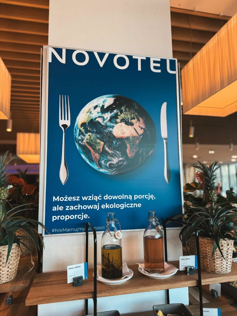 Hotel Novotel Warszawa Centrum angażuje się w działania na rzecz ochrony środowiska, będąc częścią globalnej sieci Accor, która realizuje program Planet 21. Hotel wprowadza zrównoważone rozwiązania, takie jak redukcja plastiku, efektywne gospodarowanie zasobami wodnymi oraz zmniejszanie marnotrawstwa żywności. Dodatkowo, we współpracy z fundacją WWF, wspiera ochronę oceanów. Poprzez edukację i konkretne działania, hotel dąży do minimalizacji swojego wpływu na środowisko, dbając o to, aby każdy pobyt gości miał jak najmniejszy ślad ekologiczny. W restauracji hotelowej wiszą specjalne plakaty, które zachęcają gości do przemyślanego nakładania jedzenia, by zapobiegać marnotrawstwu. To subtelne przypomnienie, że każdy z nas może przyczynić się do ochrony środowiska, nawet podczas codziennych posiłków.