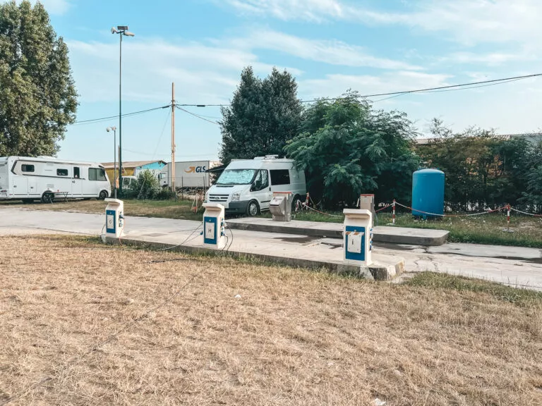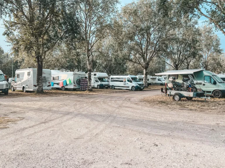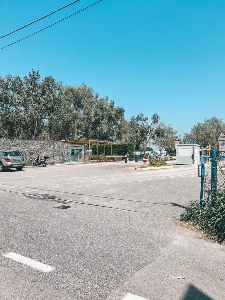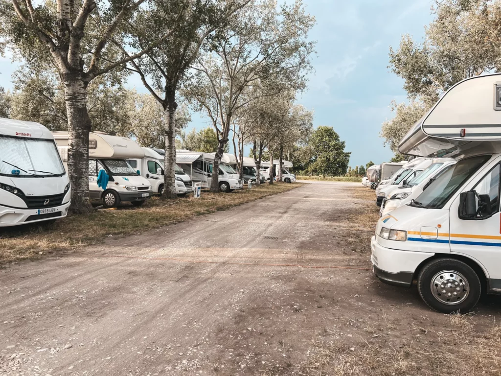 Miejsce jest przestronne i zadbane, oferując około 50 komfortowych miejsc na szutrze i trawie, specjalnie dedykowanych dla kamperów i przyczep. Dojazd do placu camperowego jest łatwy, prowadzi asfaltową drogą, co ułatwiło nam dotarcie bez żadnych problemów. Okolica od strony głównego miasta nie jest zbyt ciekawa. Znajdują się tam magazyny i jest to miejsce załadunku towarów do Wenecji. Natomiast od drugiej strony placu znajduje się park ze ścieżkami rowerowymi. Doskonałe miejsce również na poranny jogging.