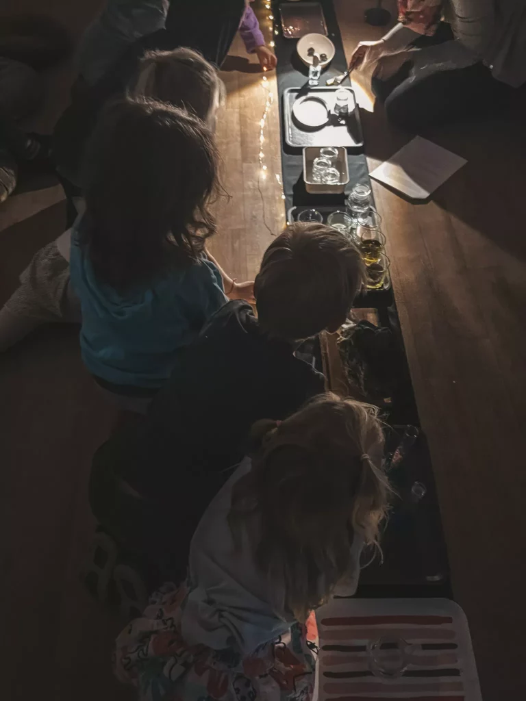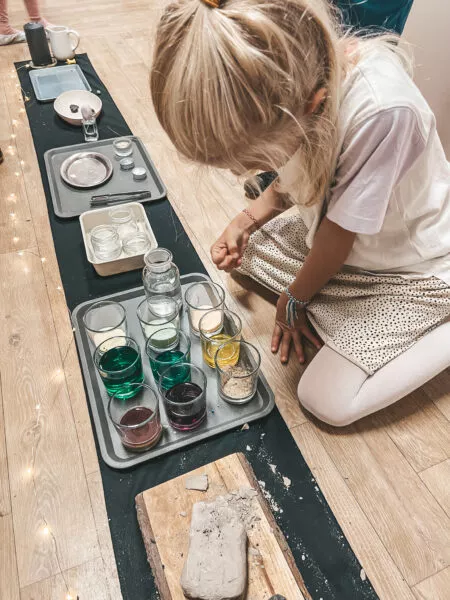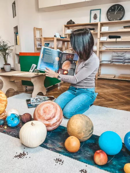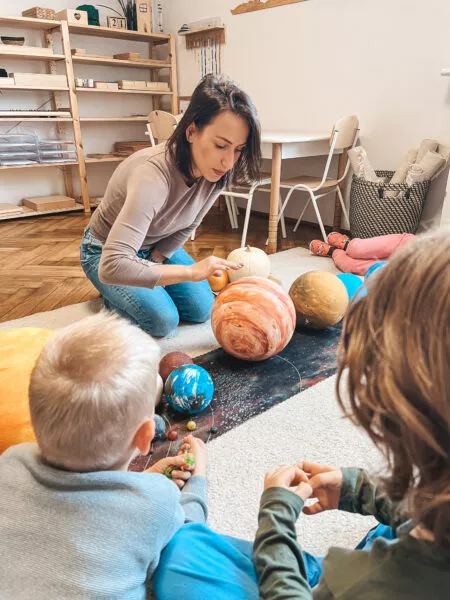 Rozpoczynając prezentację pytam dzieci czy pamiętają jak powstał wszechświat. Jak nastąpił wielki wybuch i malutkie cząsteczki pyłu i gazu zaczęły się ochładzać tworząc gwiazdy w tym nasze Słońce. Wracamy myślami do naszej Pierwszej Wielkiej Lekcji i rozmawiamy o niej. W edukacji Montessori Pierwsza Wielka Lekcja wprowadza dzieci w tematykę kosmosu. Uczniowie dowiadują się jak powstały planety, gwiazdy i cały wszechświat oraz jakie prawa w nim rządzą.