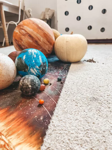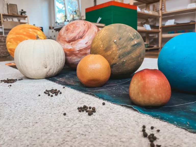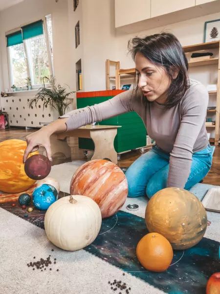 Następnie przypominamy sobie, że nasz Układ Słoneczny składa się z 8 planet, które krążą wokół Słońca na orbitach. Cztery pierwsze są niewielkie i mają skalną powierzchnię, natomiast cztery kolejne są znacznie większe a ich powierzchnia pokryta jest gazami i lodem. Aby zobrazować dzieciom różnicę w rozmiarze planet zestawiłam je ze znanymi owocami i warzywami. Merkury jest maleńki, dlatego porównać go możemy do ziarenka pieprzu, Wenus i Ziemia są bardzo podobne do sobie. Ja użyłam dwóch kolorów winogron- zielonego i czerwonego. Wykorzystałam kolejno dynię, grejpfruta, jabłka, cytryny. W zależności od pory roku możecie stosować je wymiennie np. zamiast dyni użyć arbuza.