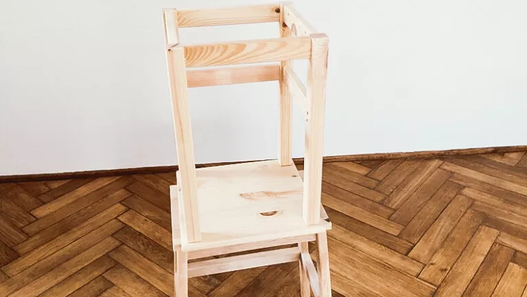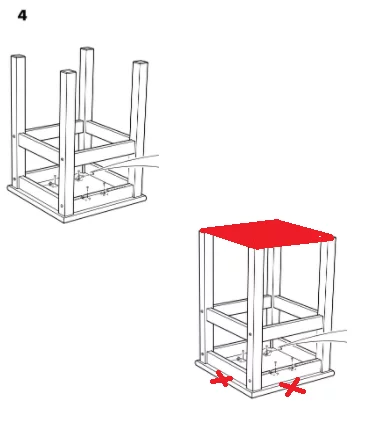 Składamy krzesełko ODDAVAR. Złóżcie nogi krzesła bez jednej dolnej listwy. Dzięki temu dziecku będzie wygodniej wejść samemu na pomocnik. Blat krzesła umieście w nieco inny sposób niż w instrukcji. Ma on znaleźć się nie na górze, lecz na dole krzesła jako podstawa Kitchen Helpera.