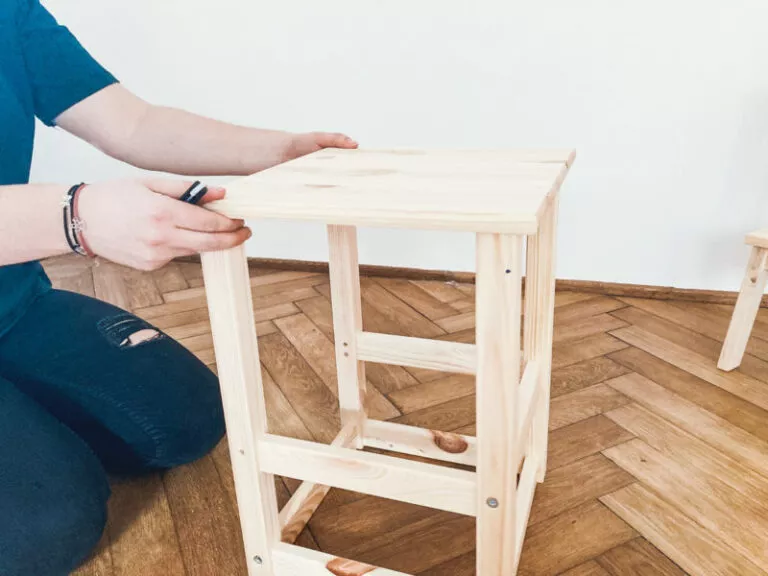 Za pomocą wkrętów do drewna skręcacie pomocnik – stołek BEKVAM to dół, krzesełko ODDVAR to góra. Pomocnik będzie już prawie gotowy. Wystarczy go teraz pomalować lub zaolejować. Prawda, że to proste?