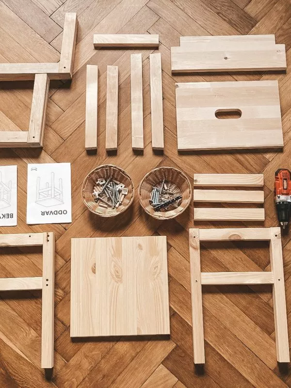 Najważniejsze meblach Ikea jest czytanie instrukcji. Cóż…  Ja pominęłam kilka kroków, co spowodowało trzykrotne składanie stołka – nie polecam! Wykonując każdy krok opisany w instrukcji złożycie pomocnik w pół godziny. I nie przejmujcie się kilkoma elementami, które zostaną! Tak ma być 🙂