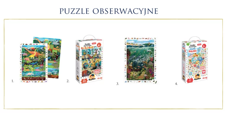 Inną propozycją dla miłośników układanek wieloelementowych są puzzle obserwacyjne. Ułożenie ich prowadzi do stworzenia szczegółowej ilustracji zagłębiającej konkretny temat – na przykład mapę Polski, plac budowy czy dno Bałtyku. Mamy więc nie tylko przyjemność z układania puzzli, ale możemy także dowiedzieć się wielu ciekawych rzeczy.
