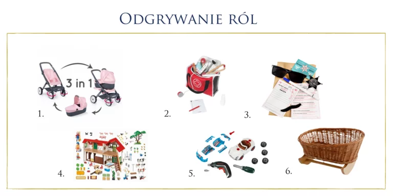 Zabawki, dzięki którym dziecko może odgrywać pewne role, to idealny wręcz sposób na naukę codziennych czynności związanych z obowiązkami domowymi i życiem w społeczeństwie. W Montessori tworzy się materiały edukacyjne, które rozmiarem są dopasowane do dziecka – w ten sposób może ono poznawać świat ze swojej perspektywy w sposób bezpieczny i wygodny.