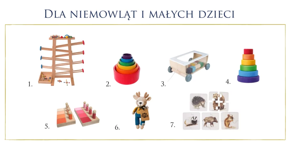 Wśród naszych propozycji znajdziecie między innymi książeczki kontrastowe, mobil Montessori, drewniany kulodrom, przytulankę-renifera robionego na szydełku, piłki sensoryczne, czy kolorowe ludziki. Zabawki te są wykonywane tak, aby nie zawierały szkodliwych substancji, dzięki czemu dziecko może swobodnie poznawać z nimi świat. Są ekologiczne, a przy tym wykonane z dbałością o szczegóły. Te przedmioty są długowieczne i z pewnością szybko się nie popsują.