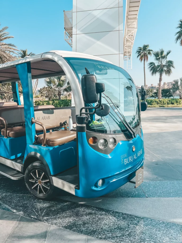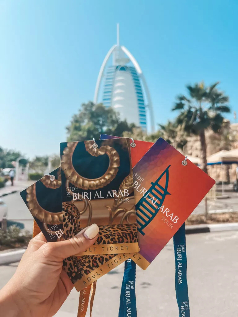 Bilet wstępu możecie zakupić w budce przed bramą wjazdową do hotelu lub na jego stronie www Burj Al Arab Tour. My korzystaliśmy z pierwszej opcji. Do obiektu dostaliśmy się niebieskim busikiem, który zatrzymał się po drodze w celu zrobienia najlepszych zdjęć budynku. W naszej grupie była jeszcze tylko jedna osoba więc komfort zwiedzania mieliśmy rewelacyjny.